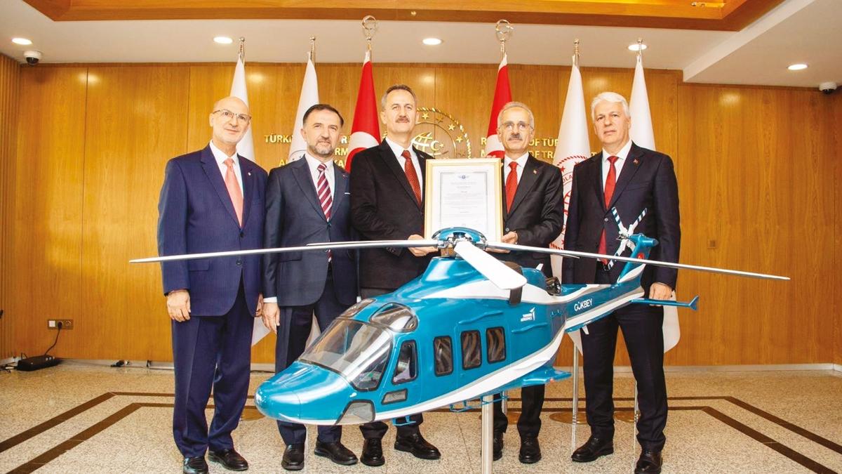Ulaştırma ve Altyapı Bakanı Abdulkadir Uraloğlu, GÖKBEY Helikopteri’nin Hava Aracı, Motor- Pervane Tasarımının ve Performansının Uçuşa Elverişlilik Sertifikasını Savunma Sanayii (SSB) Başkanı Haluk Görgün’e teslim etti.